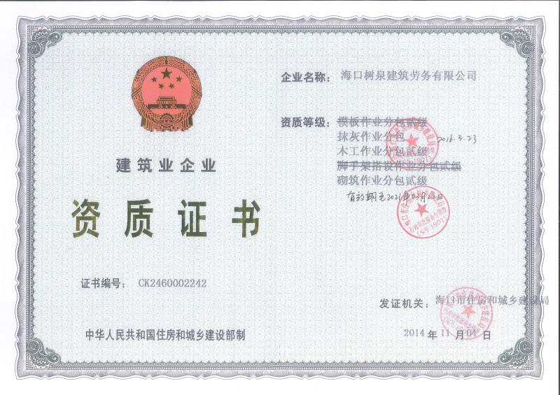 海口樹泉建筑勞務有限公司成立于2011年,公司位于???,其前身是一家專業建筑施工隊,自2004年即開始在海南從事建筑勞務施工。自成立至今,公司已經擁有一支科學管理、質量過硬、能打硬仗,搶工期的專業隊伍。能獨立承擔大中型工業與民用建筑 、室內外裝修、各類機電設備安裝工程。代表工程有??跒I海華庭、三亞時代海岸T01/02/04/05棟高層、合肥東海花園二期、陵水富力灣B區高層、三亞金中海(酒店)、瓊海大印經典花園、??诃h球海景大酒店(四星級酒店,在建中)、陵水珍珠大廈(五星酒店)、海口萬達廣場、美蘭機場二期。